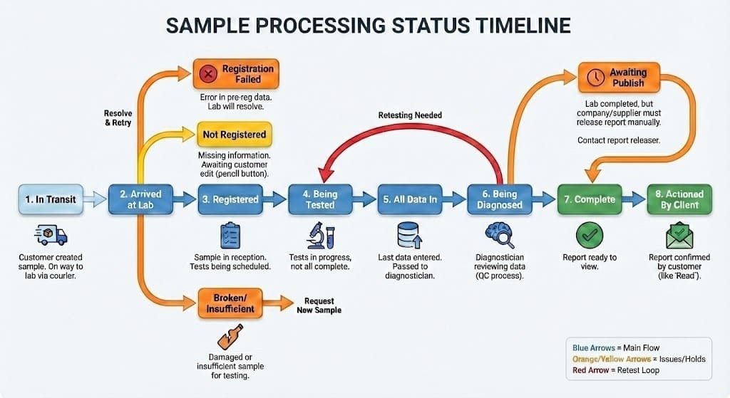 - Awaiting Publish - The sample has been completed by the lab, but your company / sample supplier separate to the lab wishes to release the reports to the end users manually or add their own comments to the findings. The laboratory cannot publish the samples. You would need to contact whoever you speak to who releases reports for you.