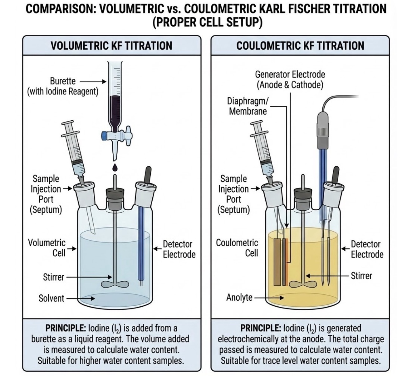As can be seen above volumetric does not have iodine generated electro chemically (coulometric) and instead is just added as a fairly regular titration reaction most are familiar with.