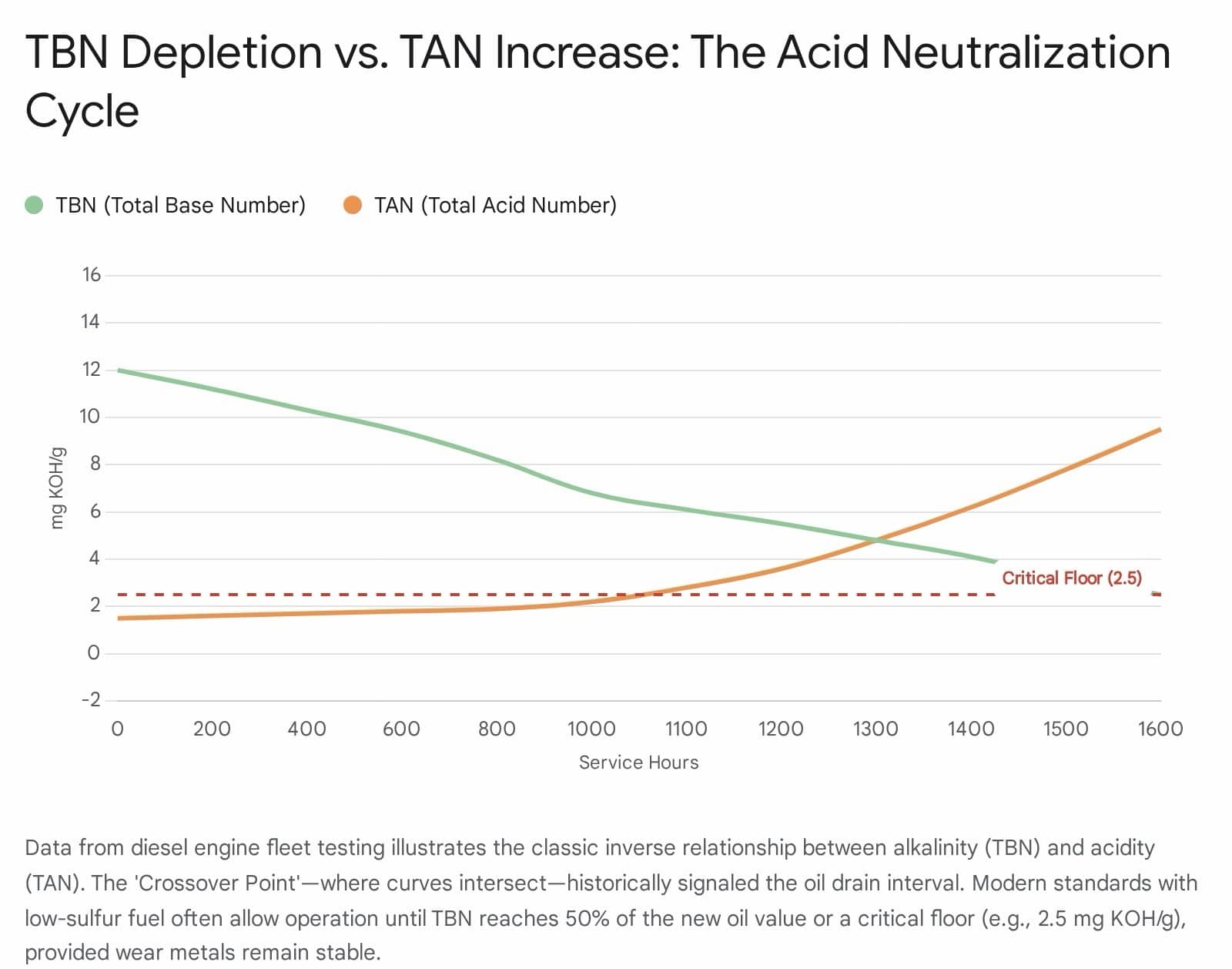 - Monitoring: Track the Total Base Number (TBN). A drop to 50% of the new oil value is a common warning limit. The “Crossover Point” where falling TBN meets rising TAN (Total Acid Number) indicates the alkaline reserve is exhausted and corrosion is imminent.