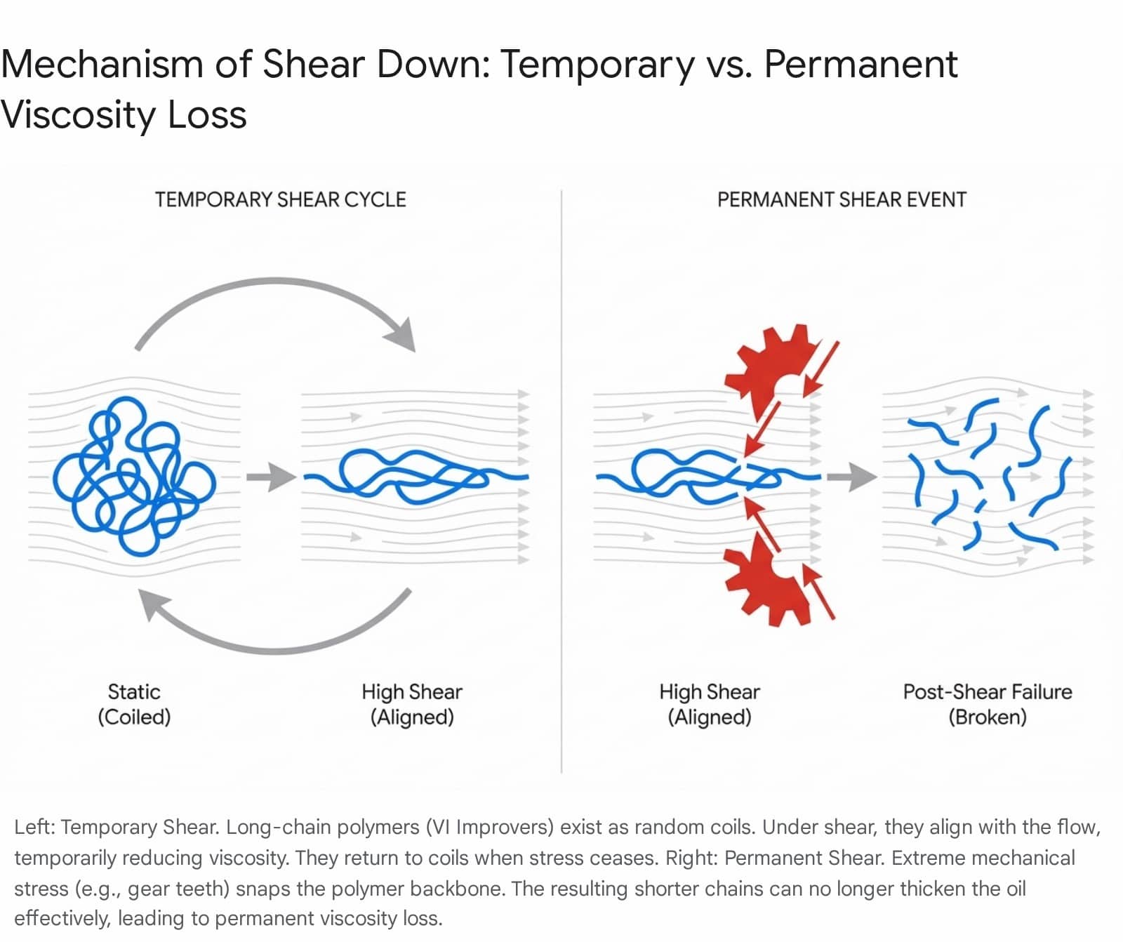 | Shear Down | Mechanical Stress | VI Improvers | Perm. Viscosity Loss (>10% drop @ 100°C) |