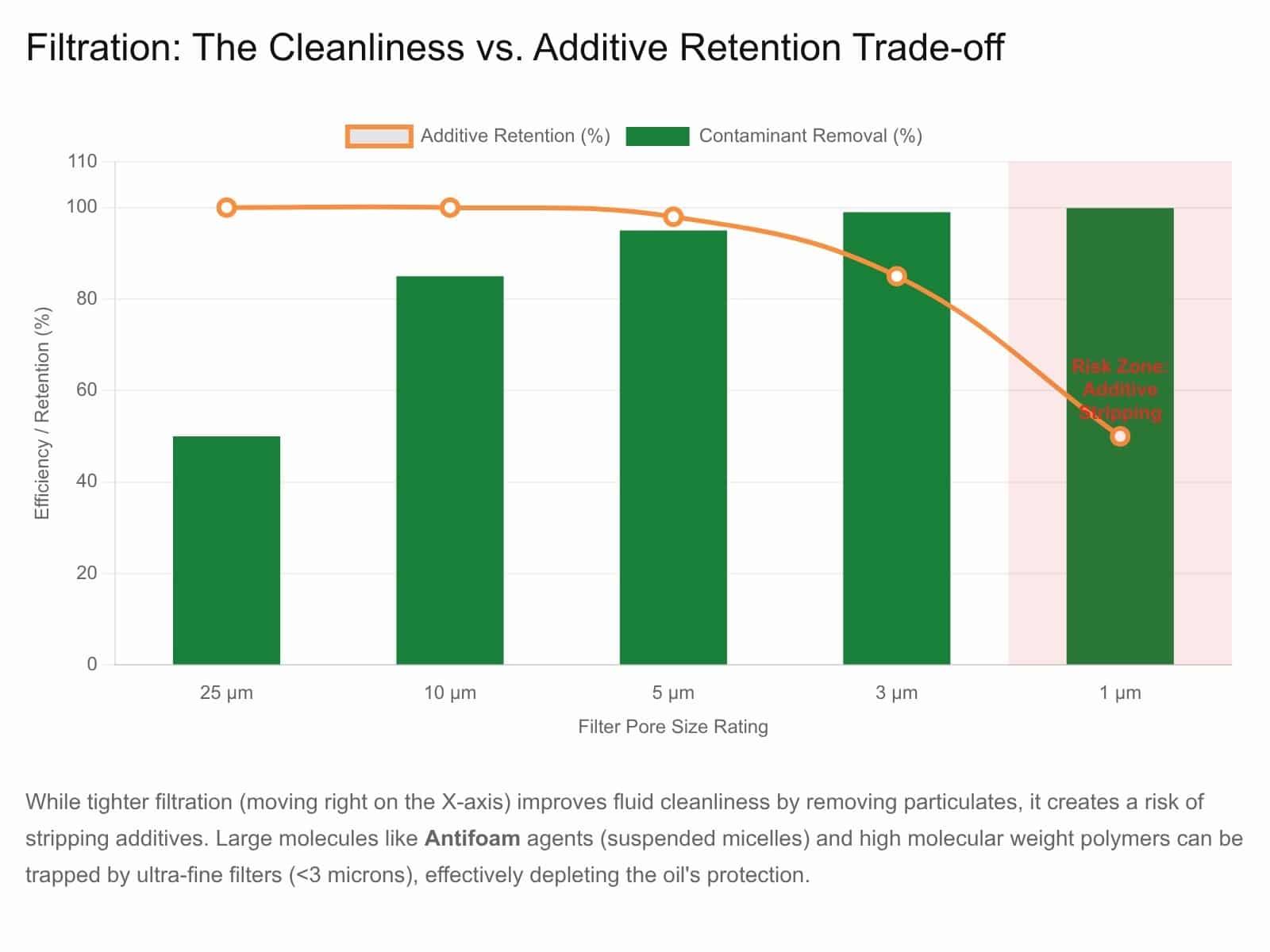 This is often surprising to most as cleaner oil just sounds better the cleaner you go, but with finer filtration often comes the challenge of removal of additives which need replacing for best lubricant function. The graph below represents a reasonably well dissolved additive like ZDDP, but additives such as silicone antifoam can be stripped at even larger sizes owing to their poor solubility in the lubricant.