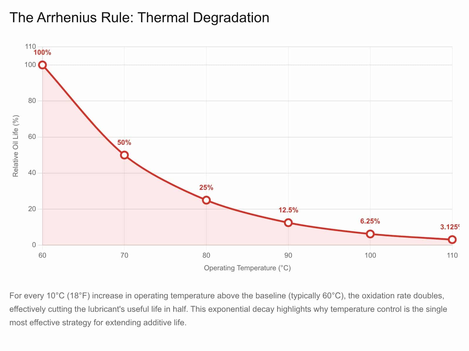 Risk Assessment: High temperature is the primary catalyst; oxidation rates double for every 10°C above normal operating temperatures (especially above 60°C) – the Arrhenius rule – see how the remaining life of the oil additives decreases rapidly with increasing temperature .