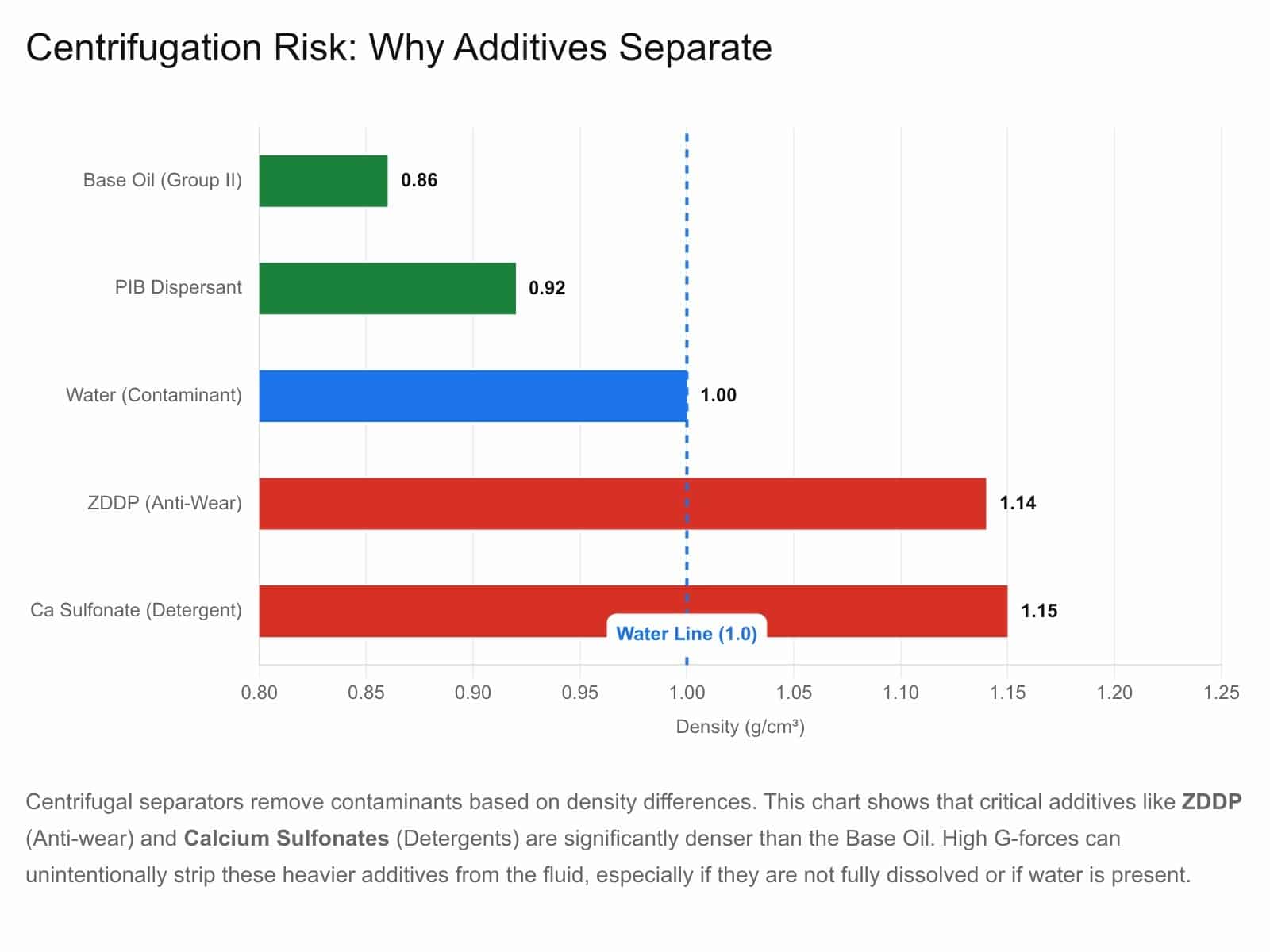 Mechanism: Centrifugal separators generate thousands of Gs of force. While effective for removing water/dirt, they can separate additives based on density. High-density additives (like calcium sulfonates or solid lubricants) can be forced out of solution if the centrifuge is operated aggressively or if the additive solubility is marginal.