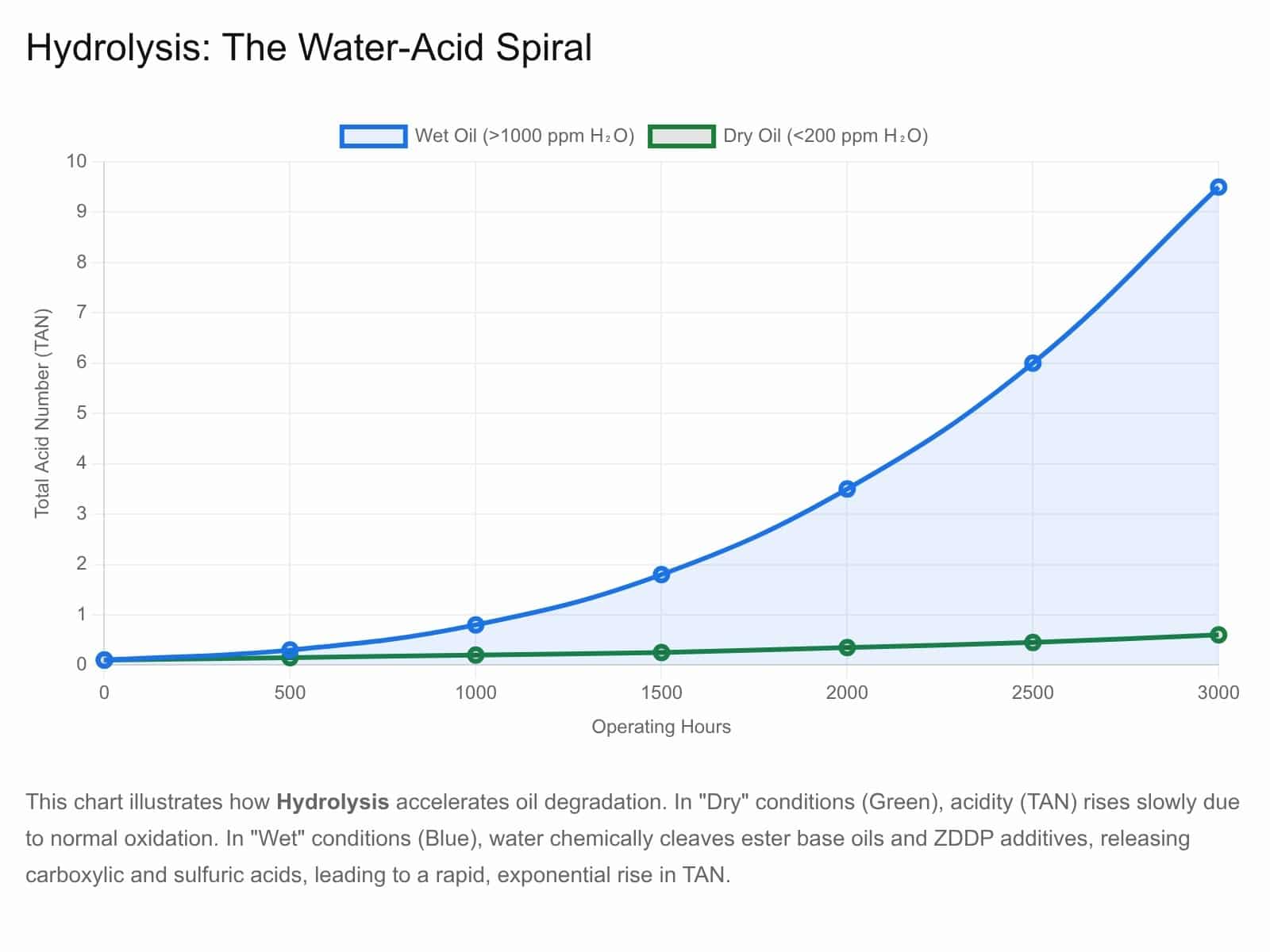 This chart demonstrates the Hydrolysis mechanism, specifically for ester-based fluids or ZDDP additives. In “Wet” conditions (high water content), the water chemically cleaves the additive molecules. This destroys the additive’s function and releases acidic by-products, causing the Total Acid Number (TAN) to spike much faster than in dry conditions.
