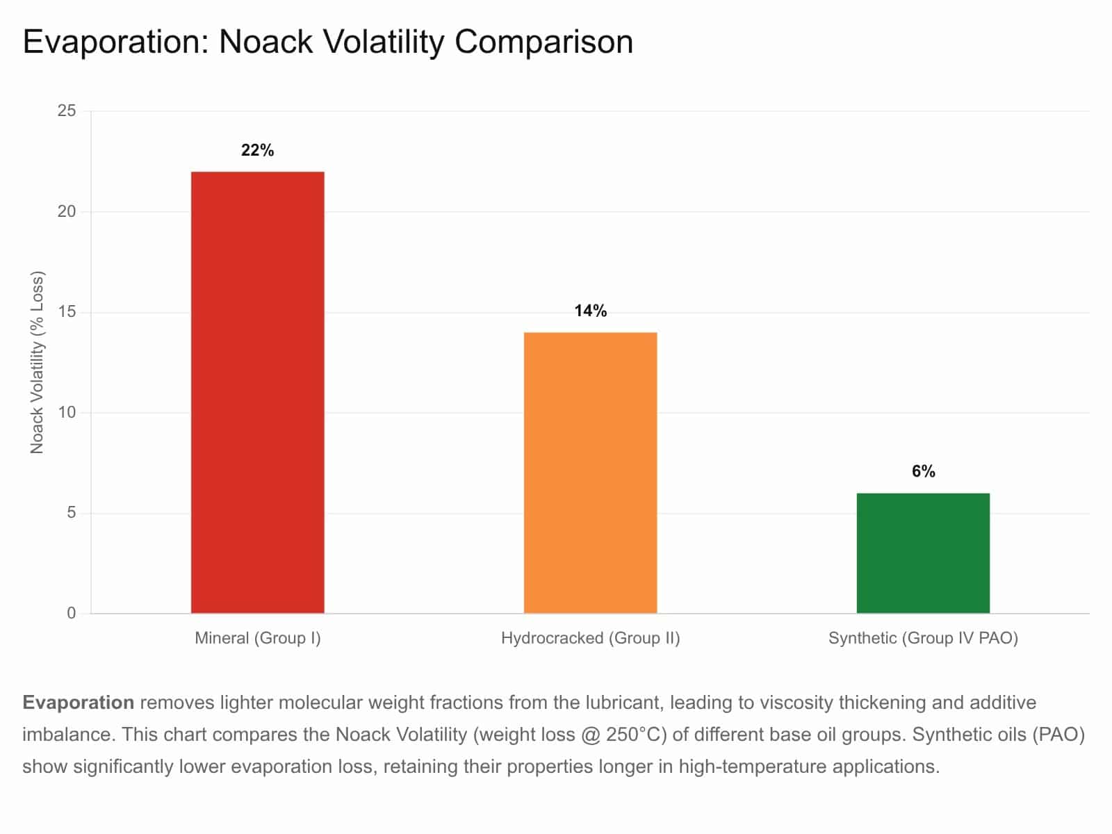 The above chart visualizes Evaporation and Volatility. Lighter fractions of the base oil and specific volatile additives (like phosphorus species) vaporise at high temperatures. High volatility leads to oil thickening (viscosity increase) and additive imbalance, as well as downstream catalyst poisoning in engines.