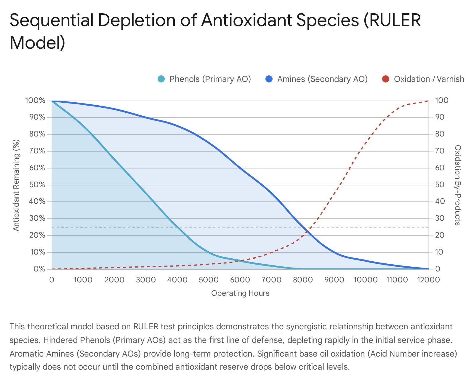 Risk Assessment: High temperature is the primary catalyst; oxidation rates double for every 10°C above normal operating temperatures (especially above 60°C) – the Arrhenius rule – see how the remaining life of the oil additives decreases rapidly with increasing temperature .