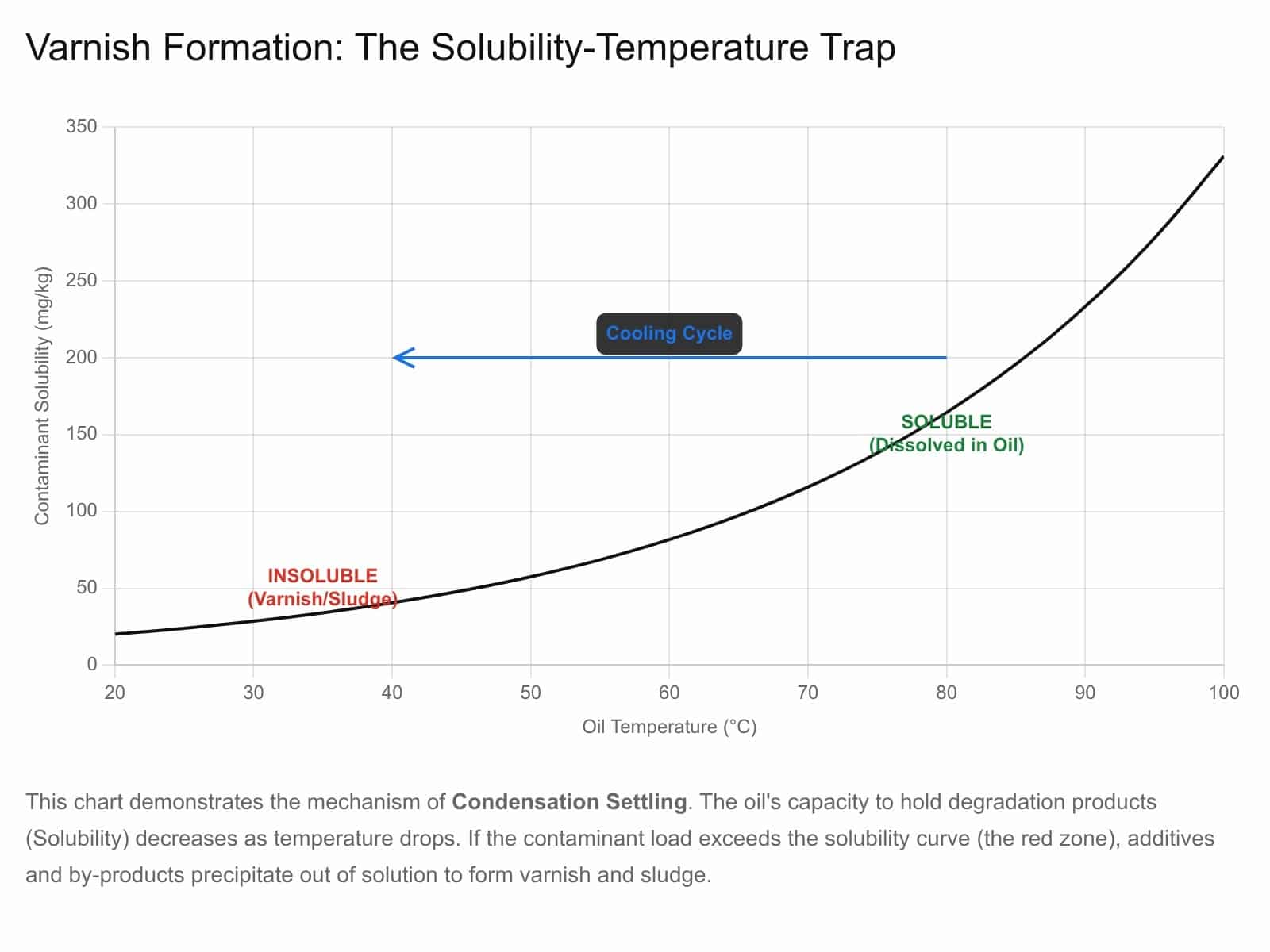 As can be seen the temperature as go from hot to cold can lead to sudden deposition of varnish such as seen in cooling systems leading to insulation and rapid increase in heat build up in the system.