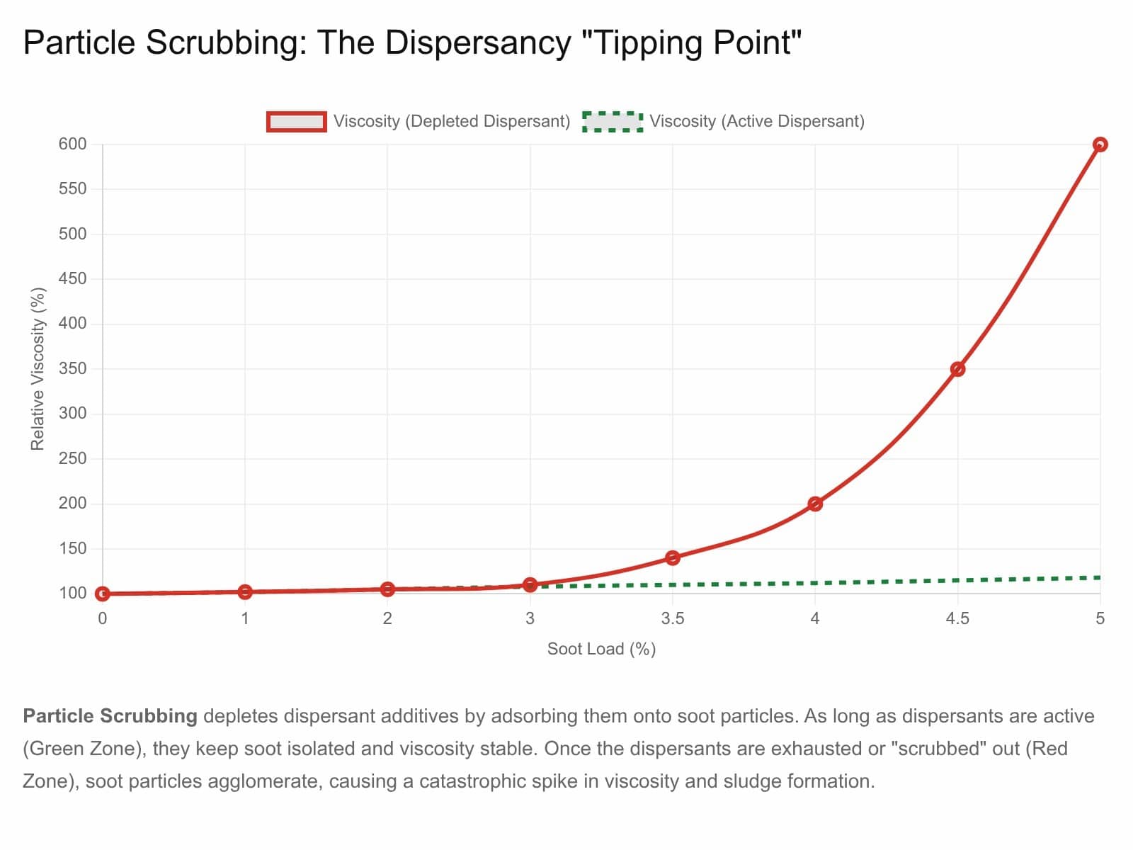 This graph illustrates Particle Scrubbing and Dispersant Depletion. • Green Line (Active Dispersants): The additives envelop soot particles, preventing them from sticking together. Viscosity remains stable even as soot load increases. • Red Line (Depleted Dispersants): Once the dispersants are “scrubbed” or consumed by the particle load, they can no longer isolate the soot. The soot particles agglomerate (stick together), causing a rapid, catastrophic spike in viscosity.